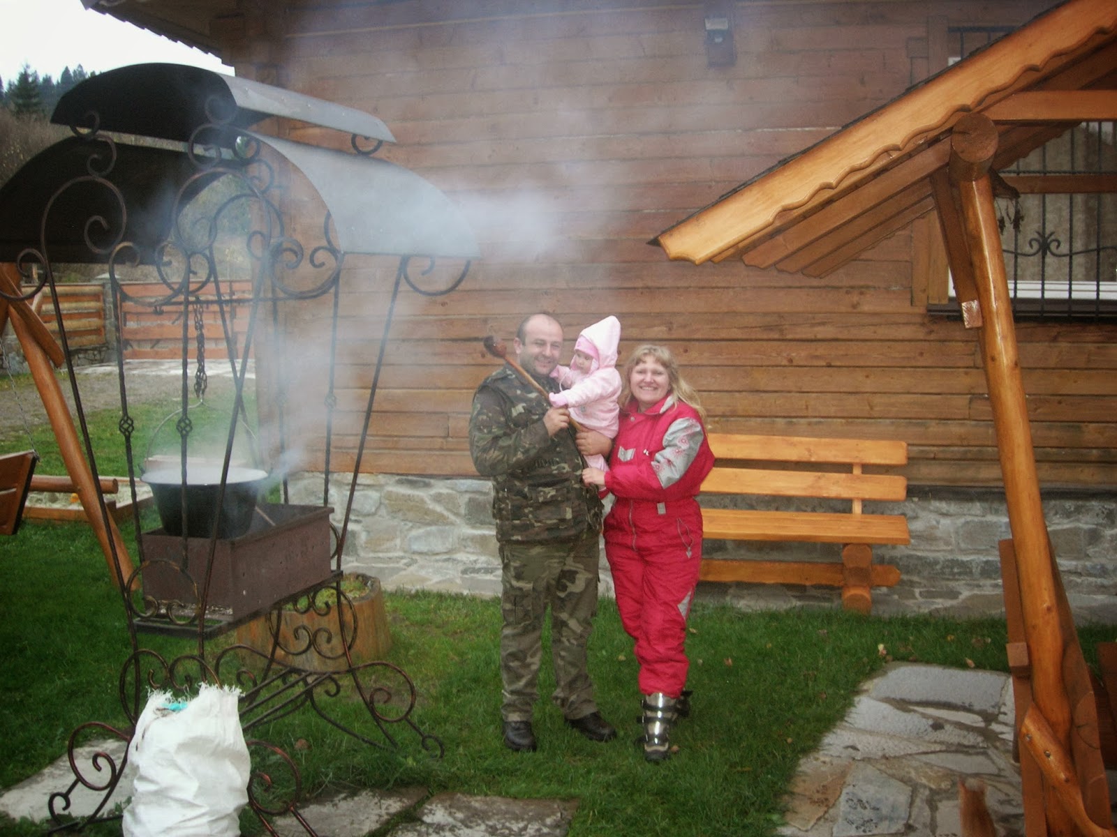 Мушу сказати, що хазяї “Гостинних котеджів” дуже уважні до деталей. Багато речей, які знаходяться на подвір”ї дуже нам сподобалися, зокрема обгороджений потічок з містком, велика бесідка, зручний мангал, на якому можна як смажити шашлики, так і варити бограч (казан нам також не прийшлось сунути за собою, бо він був у наявності). Гойдалки, дерев”яні підвазонники, столики зі стільчиками, все це милує око та робить відпочинок більш приємним.